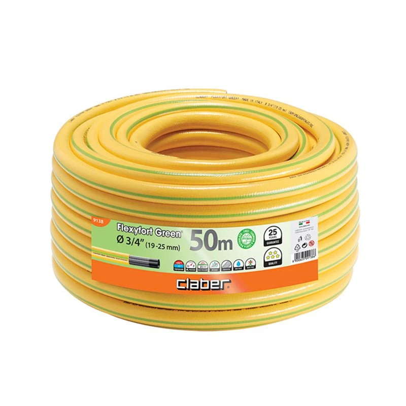 The Claber Flexyfort Green 3/4″ 50-metre hose is a high-quality kink-resistant hose with a special helix-pattern knitting reinforcement that guarantees excellent stability, even at high water pressure. The highly visible bright yellow colour makes this an ideal choice for use in commercial and agricultural applications.
