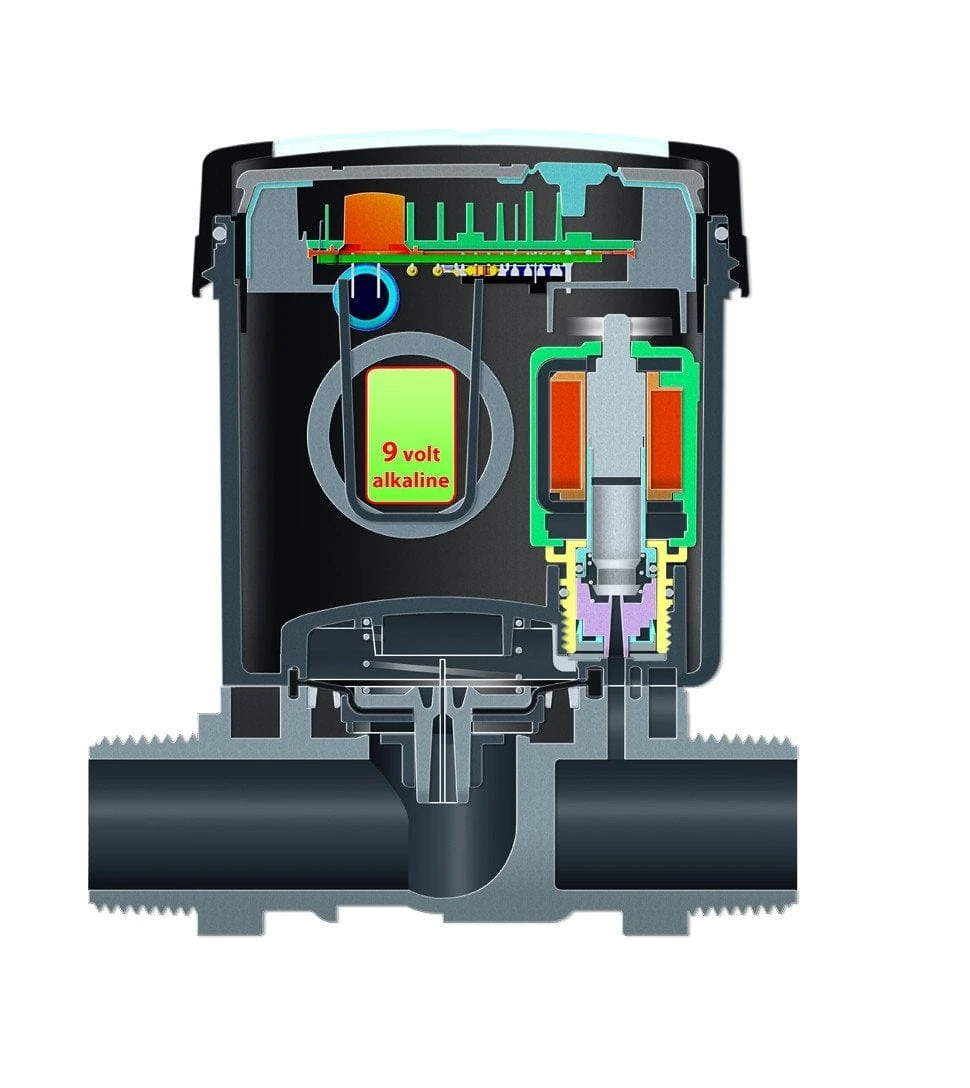 The Programmable 1″ Solenoid Valve is powered by a 9v battery which lasts an entire season (complete with digital battery status indicator). Electronic section separable from the hydraulic section for easy programming or storage during winter. Operating pressure from 0,5 to 12 bar. 1″ female inlet and outlet thread. Flow rate from 4,6 to 96 l/min. Operating temperature range +5°C to +70°C.