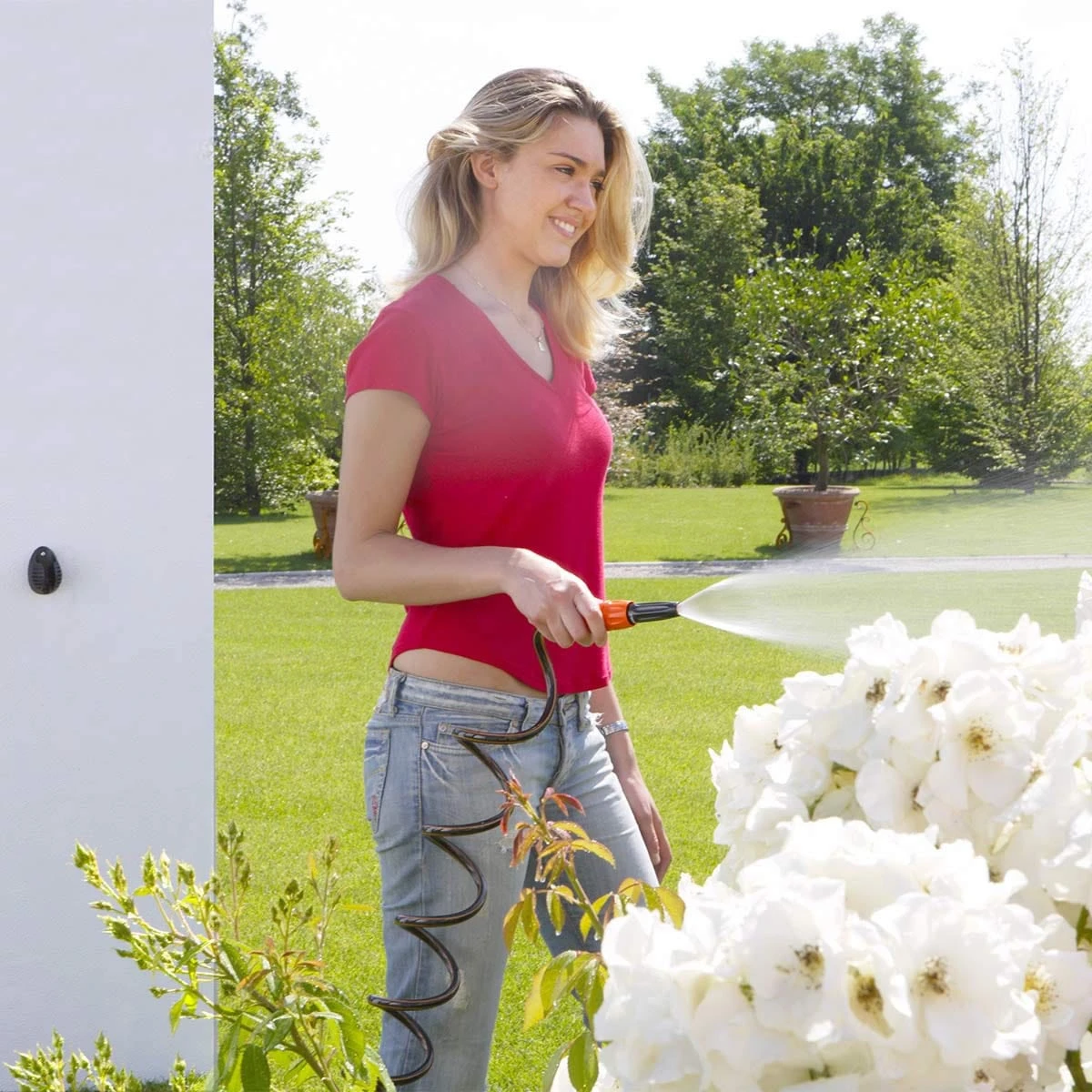 The Claber spiral hose is useful for balconies, terraces, small gardens, boats and camp sites.This hose has been designed to regain its shape after use thanks to its spiral memory design, and because of its quality material will have a long life. The Claber spiral hose kit comprises 10 metres of spiral hose, a 3/4″ threaded tap connector, a hose end connector, hose end connector with Aquastop, wall bracket with screws and plugs, and a spray nozzle with adjustable jet/fan spray.