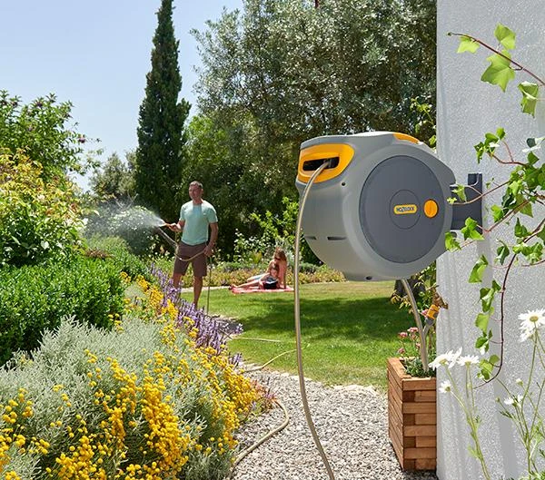 The 20 metre Auto Reel from Hozelock is a fully automatic rewind wall mounted hose reel, designed to make watering your garden easy and hassle-free. Simply pull the hose from the reel when you want to water the garden, and when you’re done let the hose retract itself. The auto reel unwinds itself smoothly and easily preventing any kinks and tangles, and you can stop at any point to water by using the reel’s locking mechanism so that you don’t have to hold the hose taught. If you need to unwind more, simply pull more out. To rewind the hose back into the reel, just a small tug unlatches the locking mechanism and the powerful spring is ready to rewind the hose smoothly and easily for you. A hose guide is integrated into the reel to ensure no tangles and kinking.