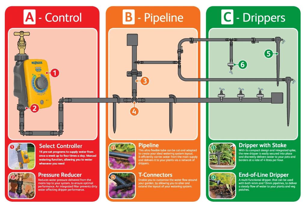 - Pro Automatic Watering Kit with all necessary pipe, fittings and emitters – can be extended to meet larger requirements with the purchase of additional parts.