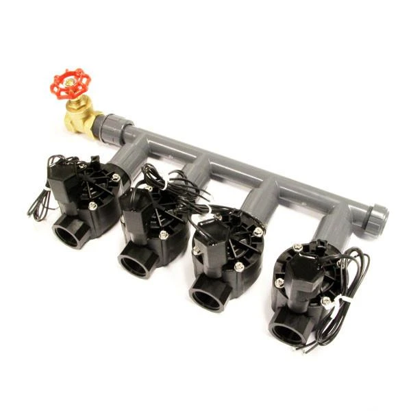 The preconfigured 4 solenoid manifold comes with four Rain Bird 1″ HV Solenoids, a Rain Bird 4 Way Manifold and other fittings required to configure ready for use with garden watering systems. The Rain Bird 4 Way Manifold is tough and ideal for all applications. With swivel nut fittings, installation (assembly and disassembly) of valves is easy, even within a tight space such as a valve box. The Rain Bird 1″ HV Solenoids provides versatility, reliability and ease of service, and is great for residential and light commercial landscapes. We’ve also included a shut-off valve for easy maintenance. For more information about the solenoids supplied see